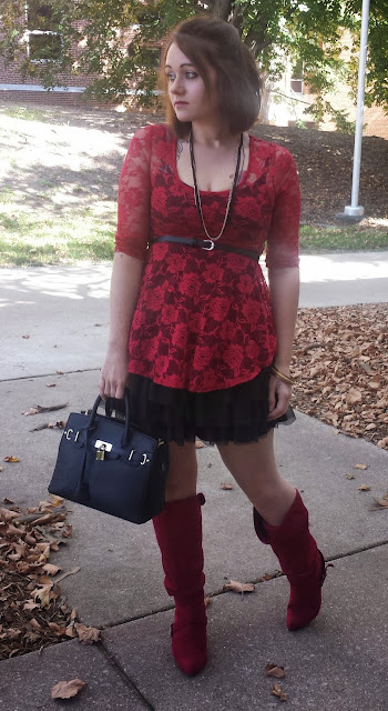Ruffles, burgundy and boots oh my! Today was a really beautiful day, mid-70s, sunshine, and of course wearing a cute outfit always puts a smile on my face. The lace on the top is so elegant, and classy that I had to add the gold accents. I was unsure at first about the ruffles but I think the skirt makes the whole look pull together.