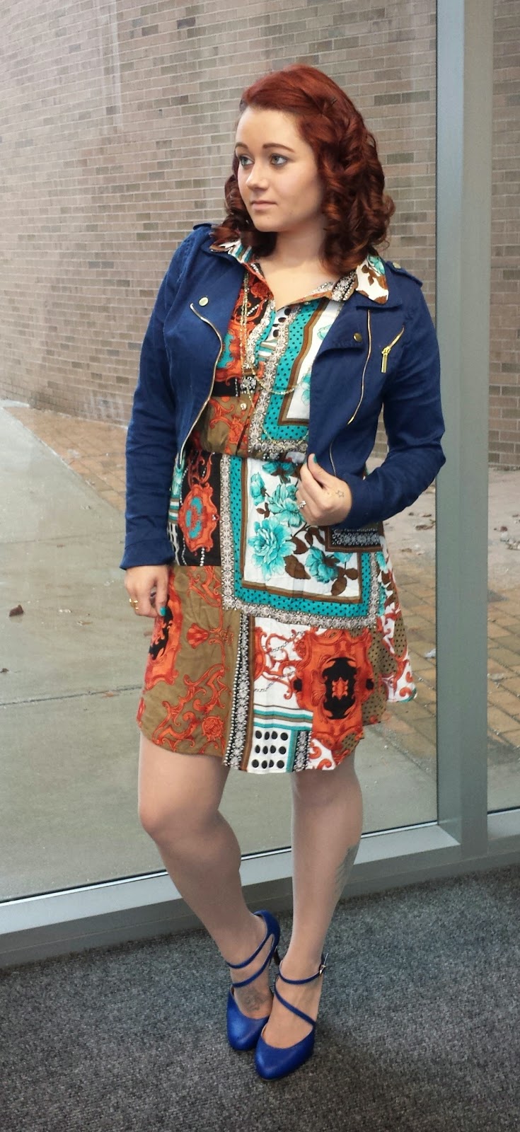 So today I wore this really fun, printed dress from AMI Clubwear, and since it is so busy I paired it with a darker (but still colorful) jacket and shoes to sort of balance it out. I love the overall look!